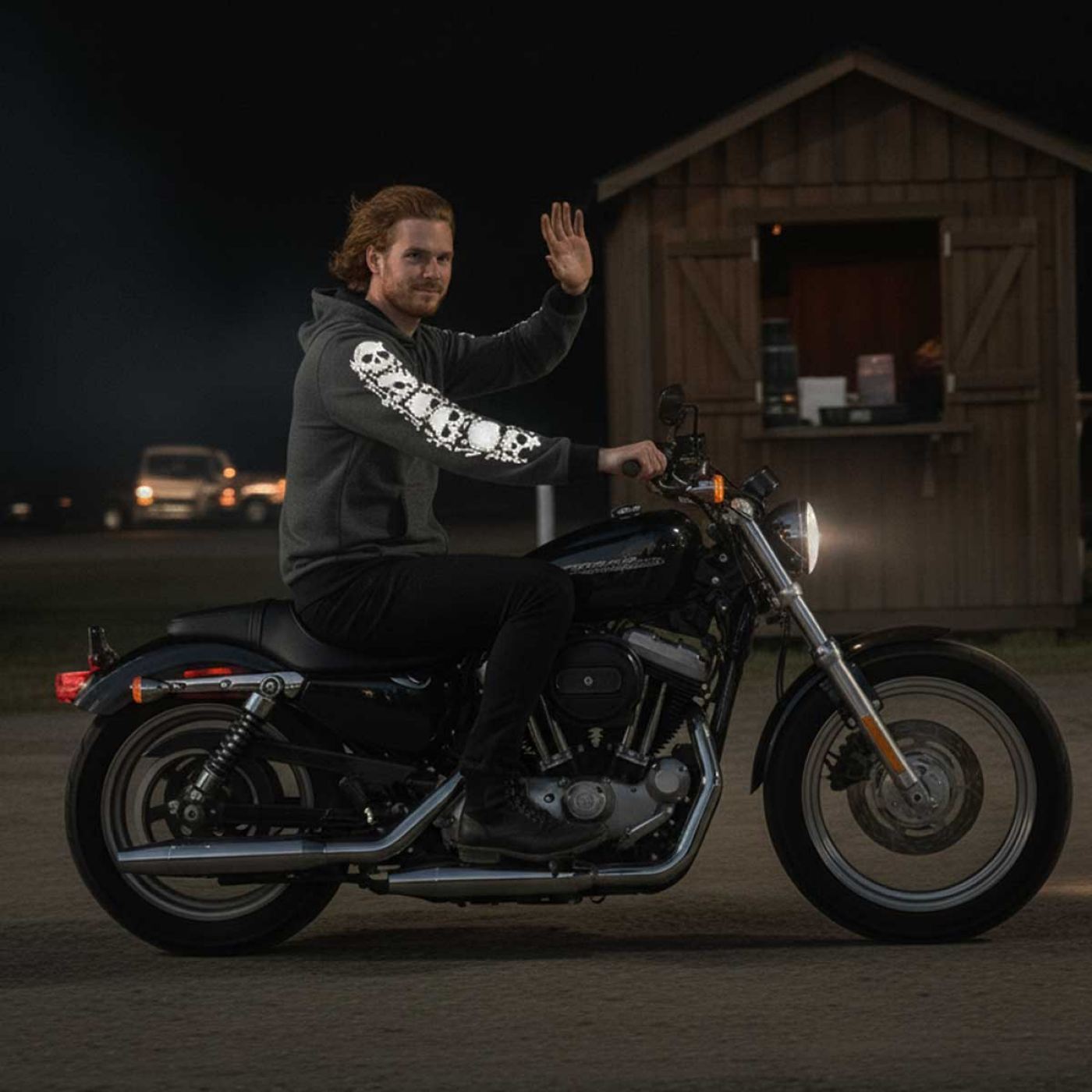 Skull print reflects under direct light for a bold night hit. DuPont™ Aramid reinforcement + removable CE armor.