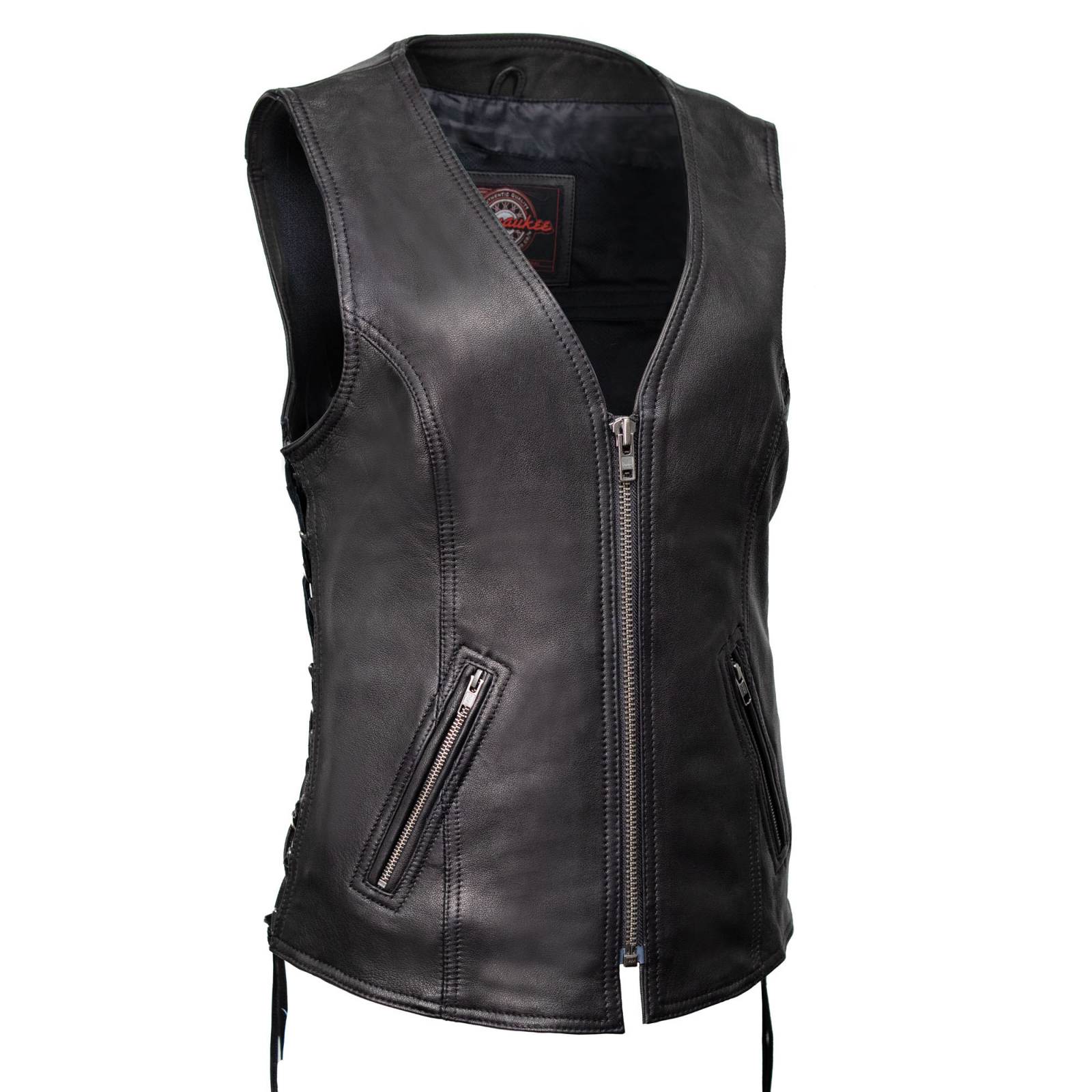 Milwaukee Motorcycle Clothing Co. Women's Jenni Black Premium Leather V-Neck Side Lace Vest MMC40001