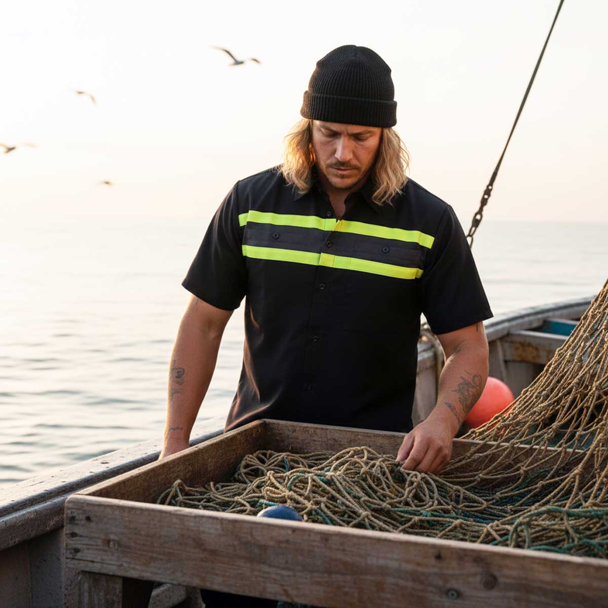 Dual chest pockets with a dedicated pen slot keep small tools and route notes on deck. Built-in microfiber cleaning cloth panel for your glasses, phone, or tablet.